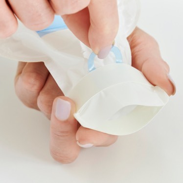 Håll i överdragets flik längst upp på påsen och dra nedåt tills det är helt borttaget.