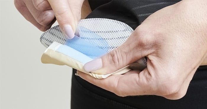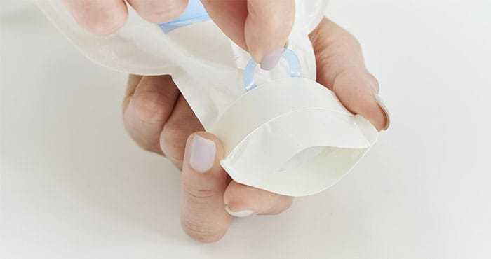 Använd fliken för att lossa överdraget längst upp på påsen och dra av överdraget uppifrån och ned så att du ser stomin och eventuell avföring. Sätt sedan tillbaka överdraget i sitt ursprungliga läge genom att trycka tillbaka överdraget på kardborren.